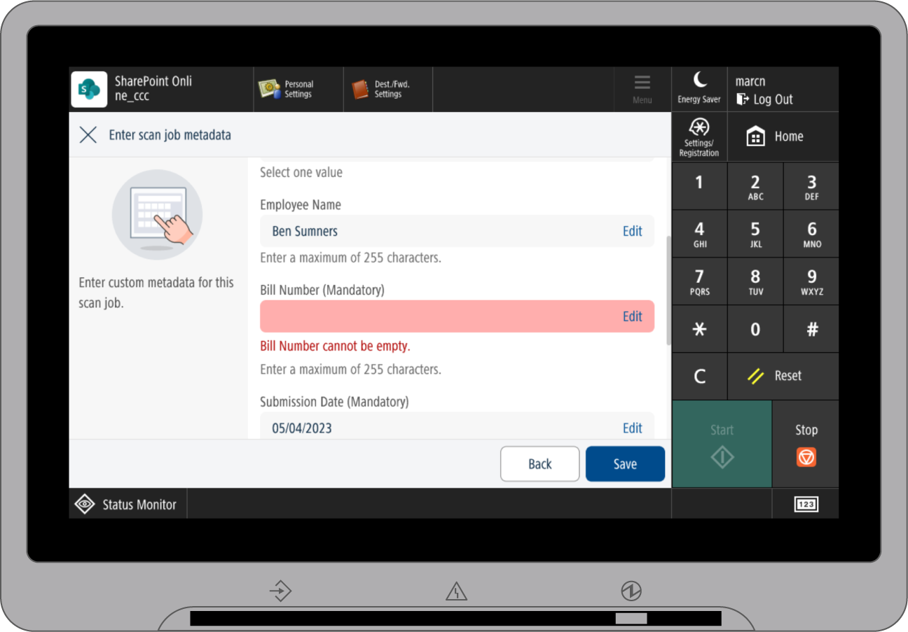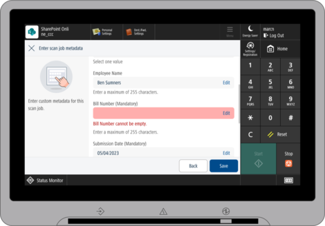 Um Dokumente direkt am Gerät zu indexieren, können Administratoren einem Dokument verschiedene Inhaltstypen wie Rechnungen, Versandlisten oder Verträge vorgeben. Bei Auswahl des Inhaltstyps ändern sich die entsprechenden Metadaten. Metadaten können manuell am Drucker eingegeben werden und werden automatisch validiert.