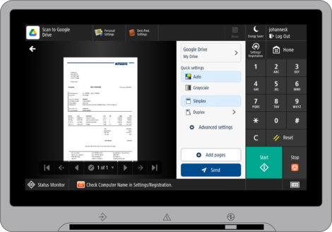 Benutzer können auf jedem unterstützten Gerät, das mit uniFLOW Online verbunden ist, problemlos persönliche Scan-Workflows auswählen. Die Online-Speicherung von gescannten Dateien ermöglicht einen einfachen, weltweiten Zugriff, so dass die gemeinsame Nutzung von Daten mit Kollegen und Kunden ebenfalls erleichtert wird.