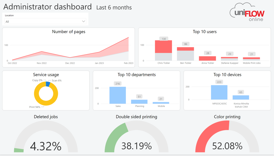 Information on business' print, copy, fax and scan usage is useless unless this information can be collated into reports. The uniFLOW Online portal contains graphical report types that a customer can create - user details, device details and summary, sampling by department and many more. Report contents can be changed instantly by selecting filters e.g. specific users, groups, printers or date ranges. Filtering per location is also possible, quickly generating an overview for a particular location. Summary reports display the previous year's data and sampling reports show data of the last six months.