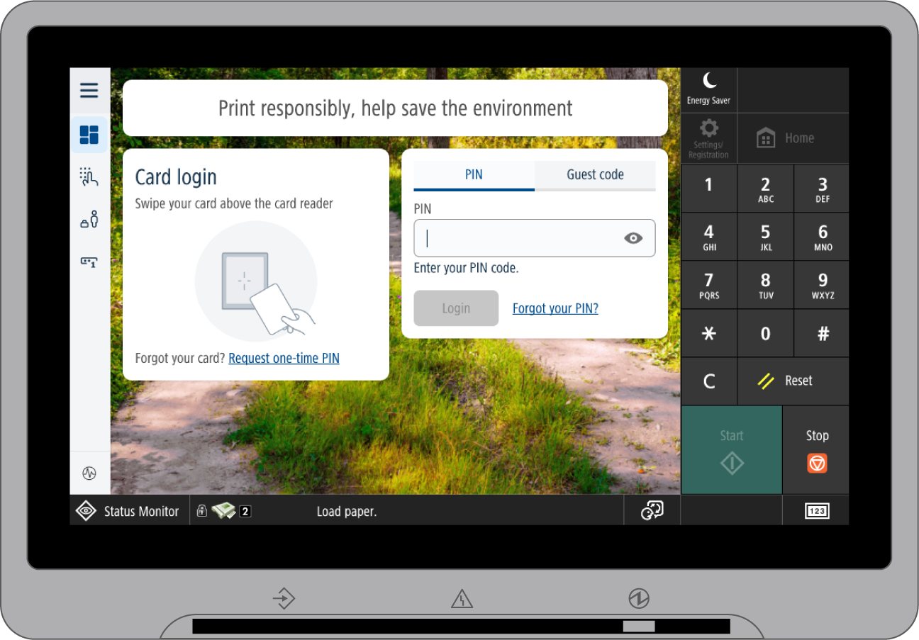 The Universal Login Manager allows access to the Canon device for identified users only. The clearly structured login screen allows multiple login widgets, e.g., PIN or card authentication, combined with a message widget. The login menu shortcuts and background can also be configured to align with a business’s corporate identity. It enables device-specific settings and will allow restrictions on single-device features e.g., copying or printing. The Universal Login Manager embedded applet facilitates device login functionality and on-device cost center selection.