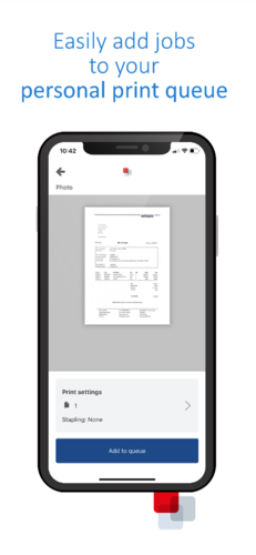 Finishing options can be set within the app before printing. My Print Anywhere ensures print job availability at every device. Current print jobs can also be accessed and released on any device from any vendor via the app, providing a truly flexible work environment.